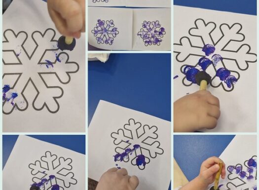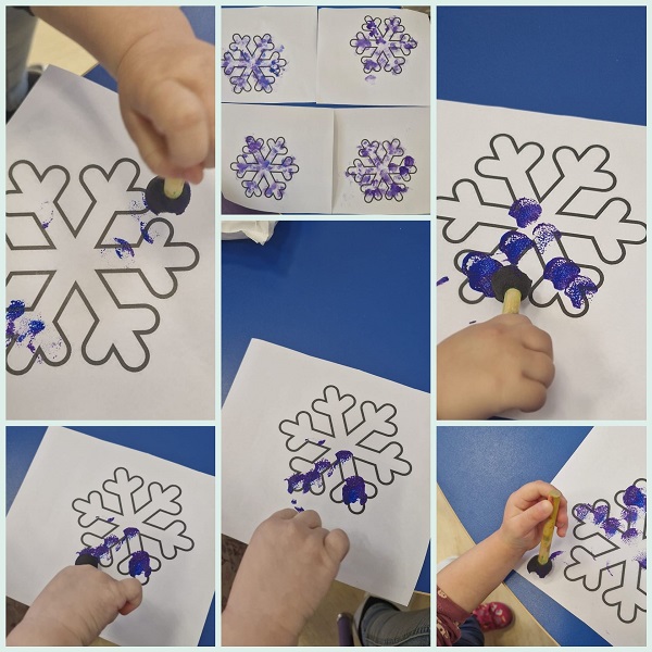 • Lavići – bojanje pahuljica pomoću otiskivanja spužvice na pahuljice . Razvoj fine motorike i kreativnosti