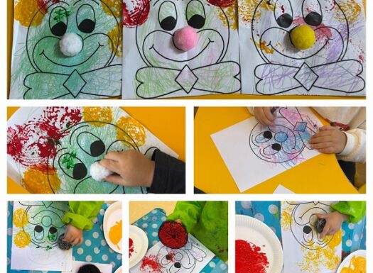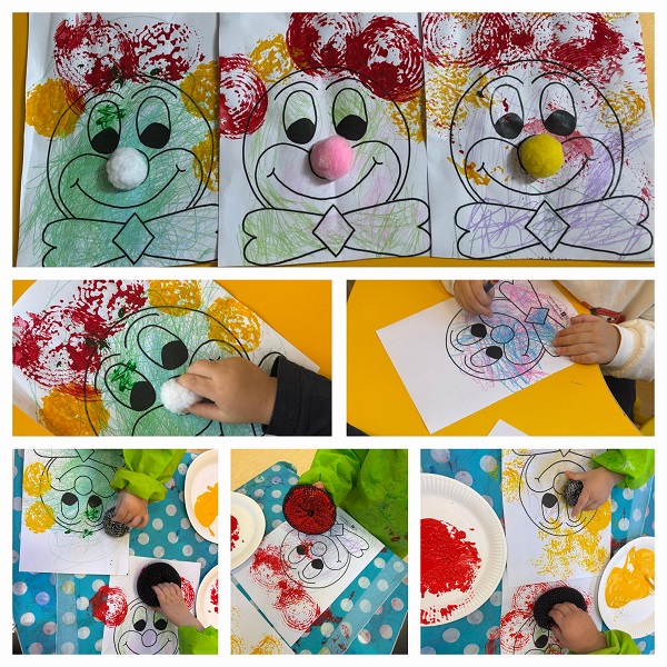 • Žirafice – Klaun – otiskivanje žičanom spužvicom, bojanje pastelama. Poticanje na razvoj fine motorike, kreativnosti.